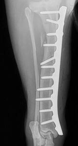 This patient was a large adult dog who was stuck by a car. This caused a complete short oblique fracture of his tibia. Due to his size, the nature of the fracture and his energy level traditional methods of stabilization (splinting etc) had risk of failure or inadequate healing.